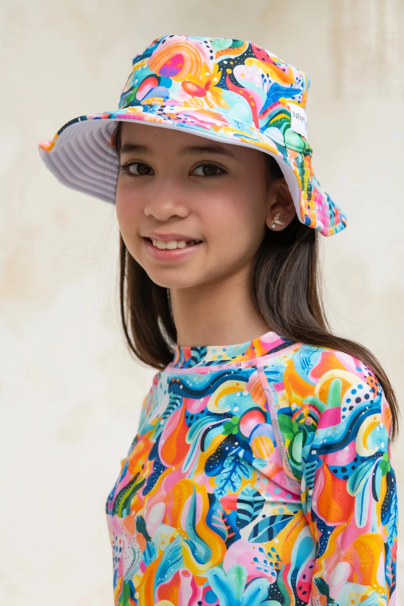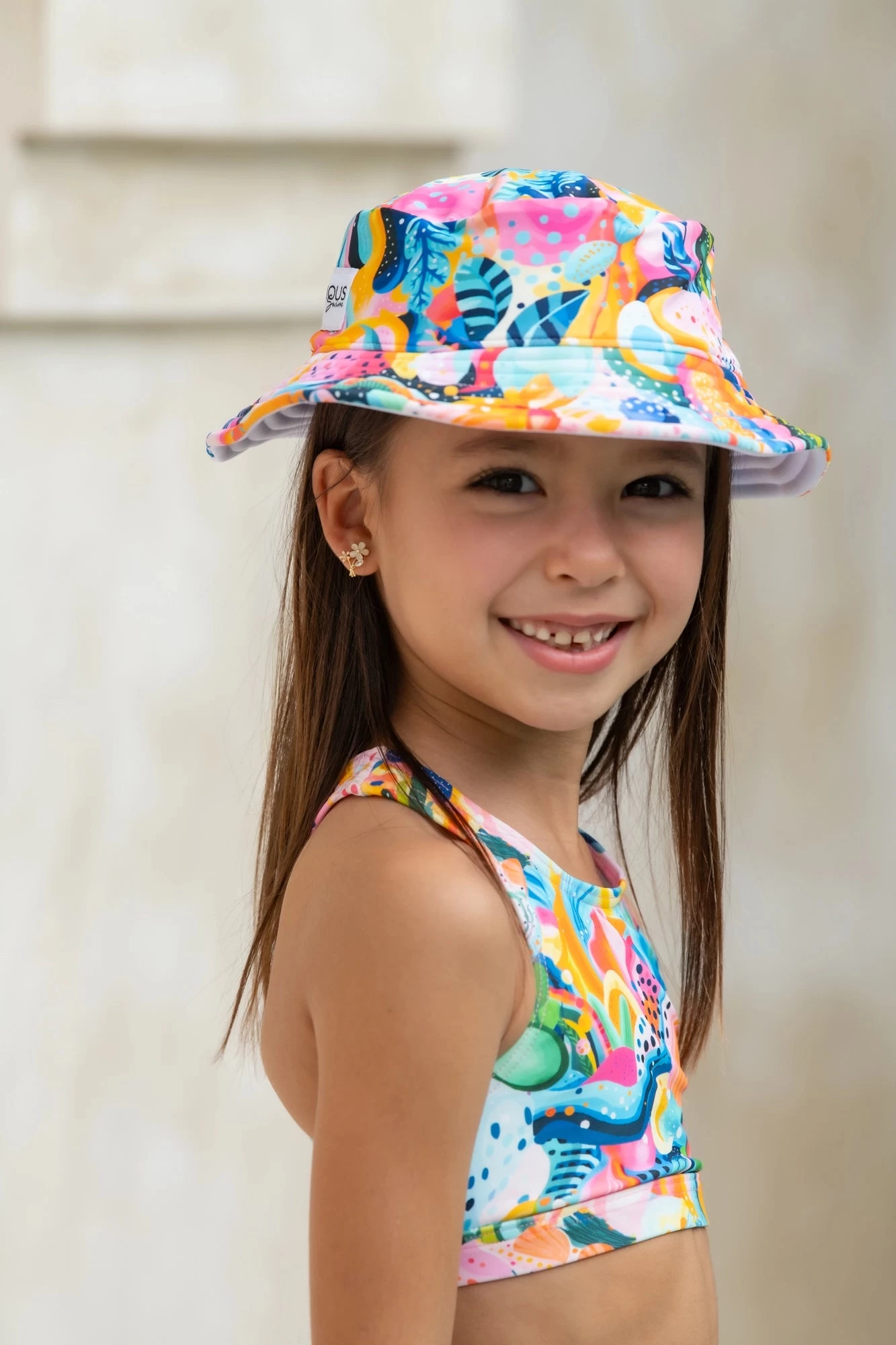 The Daisy Hat is the perfect choice for your little ones to match back with their Fruity Seabed swimwear. Crafted in the same luxury Polyamide Spandex fabric as our swimwear, this hat is ideal for the pool and the beach. Features adjustable chin strap.
