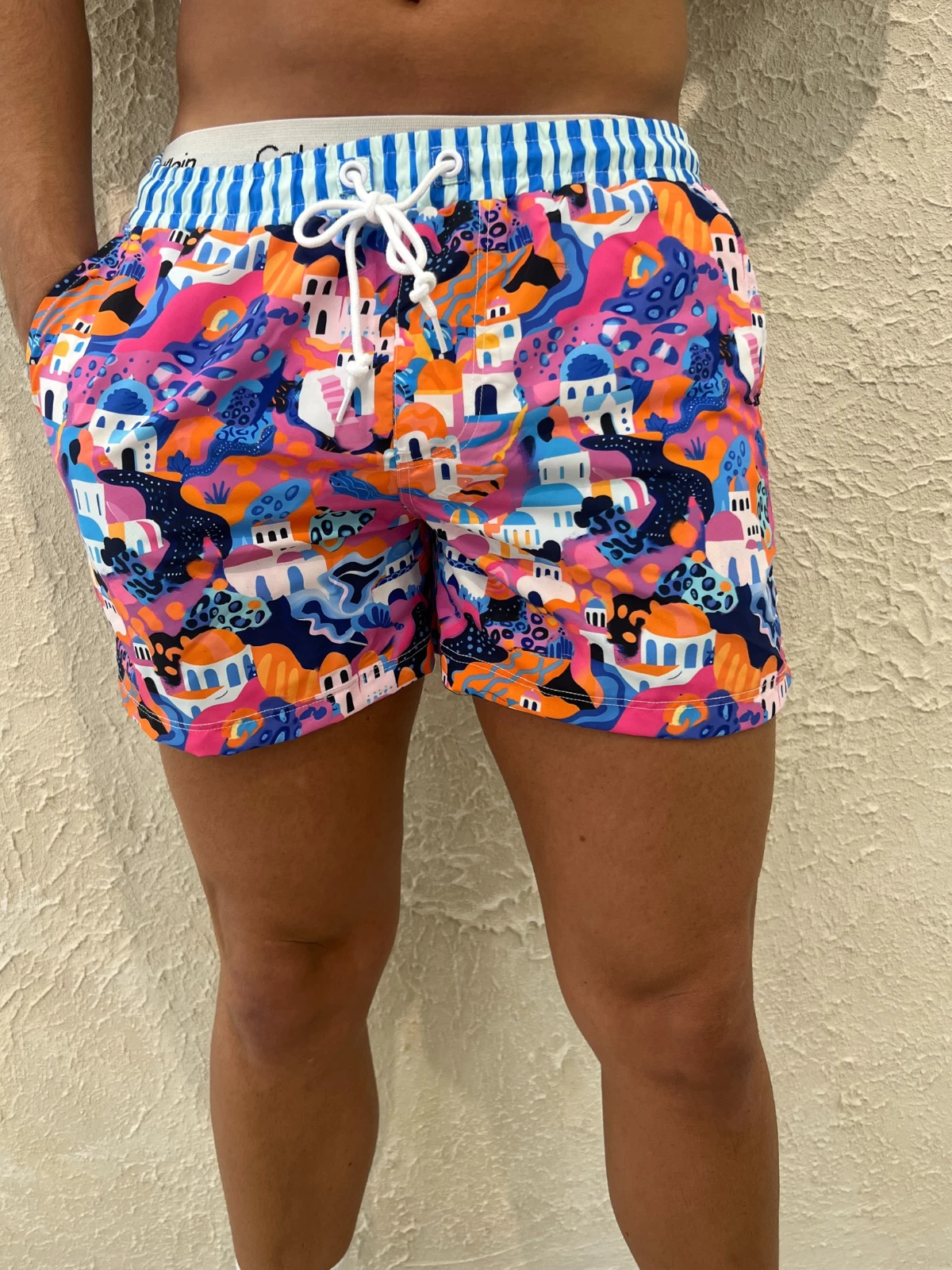 Step into seaside elegance with “Mediterranean Vista” swimwear, featuring unique island palace motifs against a backdrop of pink, sea blue, and orange, evoking the charm of a vast and beautiful coastline!