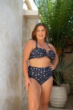 Embrace beachside charm with “Mellow Leopard” swimwear, flaunting pale purple leopard spots on a black backdrop for a chic and alluring beach look! 🐾👙