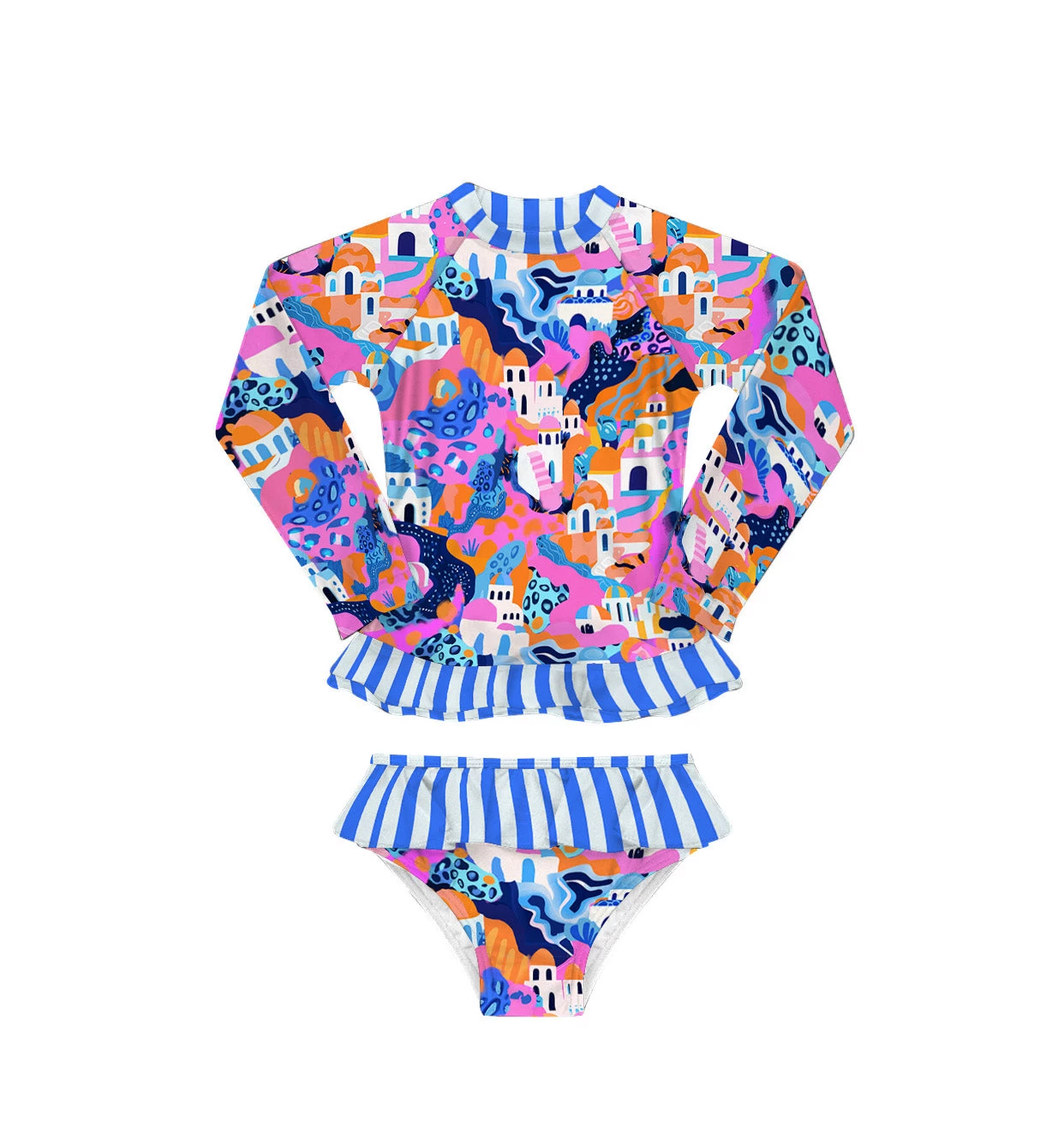 Step into seaside elegance with “Mediterranean Vista” swimwear, featuring unique island palace motifs against a backdrop of pink, sea blue, and orange, evoking the charm of a vast and beautiful coastline!