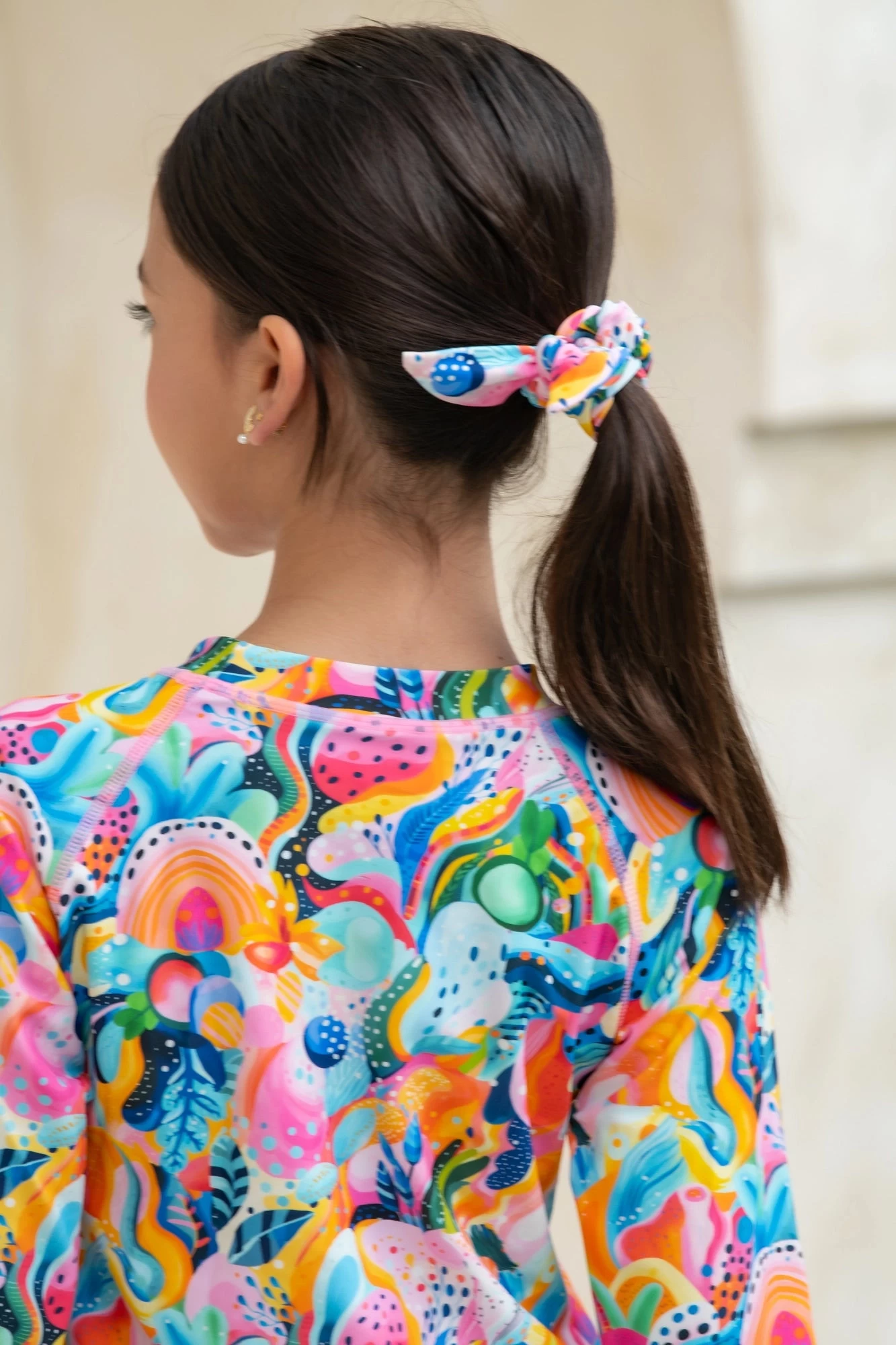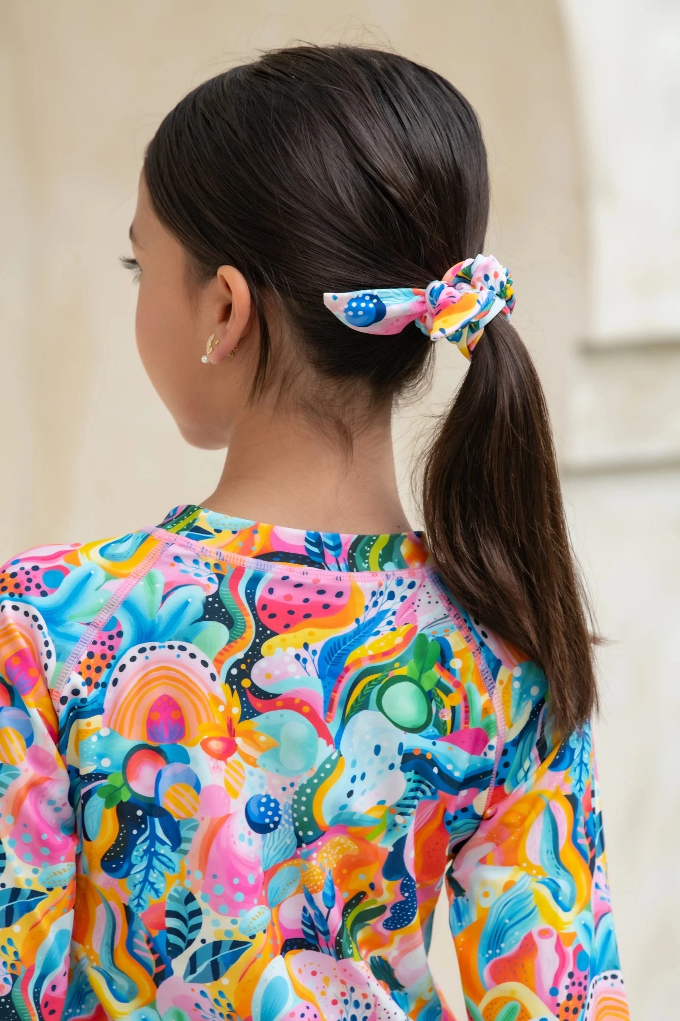 Our Mini Mimi scrunchie is the ultimate finish to your summer swimsuit, wear it at the beach, pool, or as you run about your day.